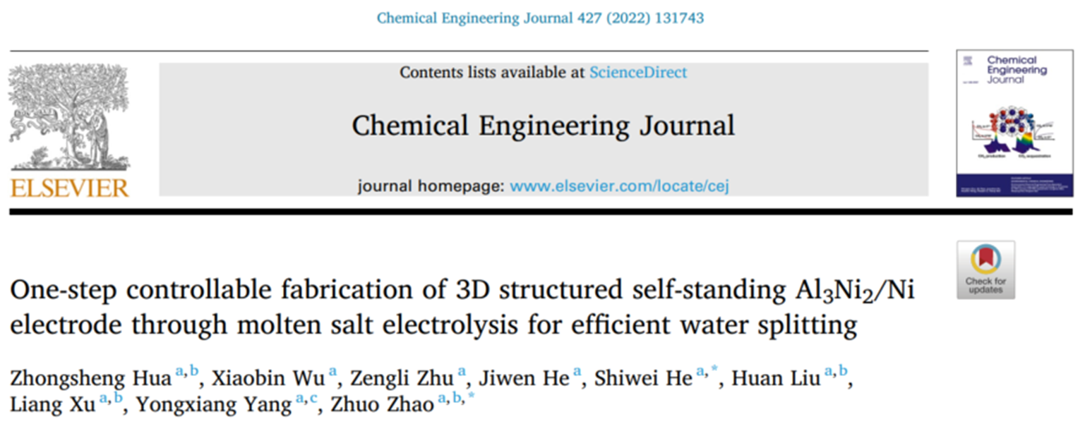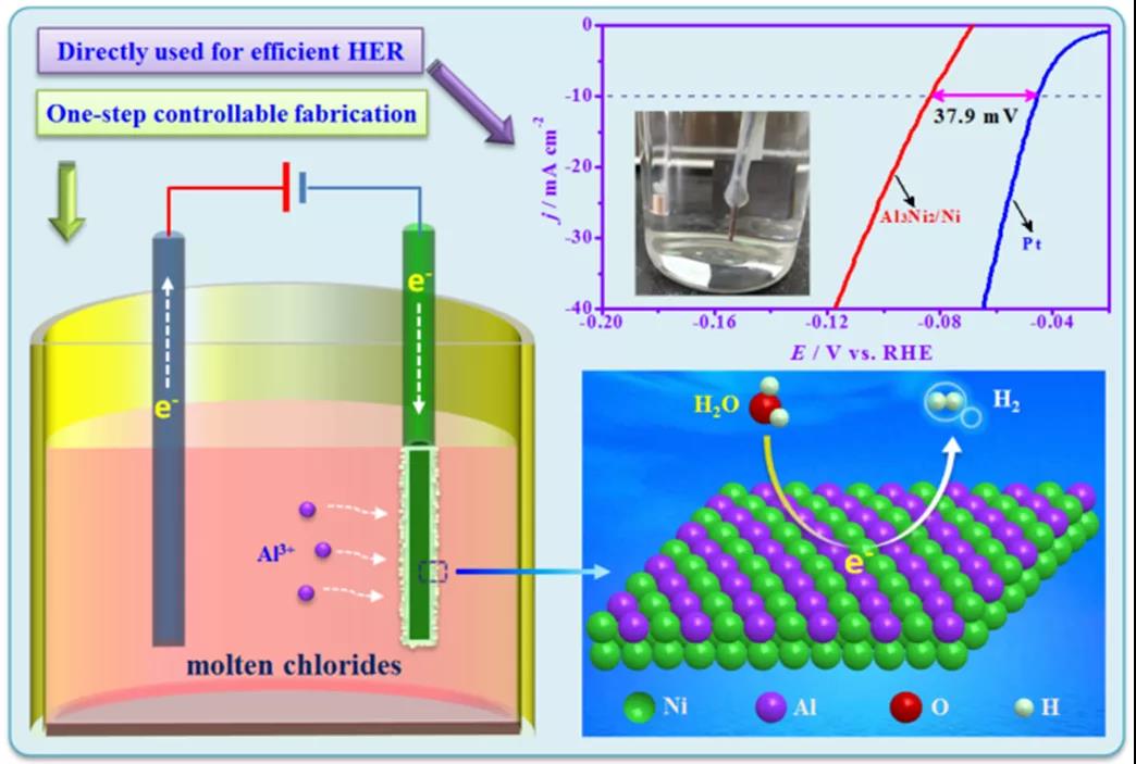 现阶段,在全球范围内化石能源日趋枯竭和环境污染愈发严重的这一严峻形势下,开发清洁高效、可再生的新型能源成为世界各国应对能源危机的必然选择。氢能作为一种绿色、高效、安全、可再生的二次能源,是未来代替化石燃料实现可持续发展的理想能源,因而受到了人们的广泛关注。电解水制氢被认为是制备氢气最可行、最成熟的方法。Pt等贵金属是目前电解水制氢最理想的催化剂,但是其资源稀缺、价格昂贵,极大地限制了电解水制氢的大规模应用。因此,设计和开发低成本、高催化活性的非贵金属电催化剂是推动电解水制氢走向大规模工业化应用的迫切需求。 近日,安徽工业大学赵卓教授课题组在电解水制氢领域取得新进展。该课题组采用熔盐电解的方法,使Al3+在金属Ni基体上发生电化学还原并形成以Al3Ni2相为主的合金镀层,从而制得了一种可直接用于电催化析氢的自支撑型电极。所制备的自支撑型Al3Ni2/Ni电极表面具有3D菜花状的微观结构,在0.5M硫酸电解质中表现出了可与Pt相比拟的电催化活性:10mA/cm2电流密度下的析氢反应过电位为83.4mV(仅比Pt高37.9mV),并展示了良好的稳定性。该工作以One-stepcontrollable fabrication of 3D structured self-standing Al3Ni2/Nielectrode through molten salt electrolysis for efficient water splitting为题发表在Chemical Engineering Journal上。