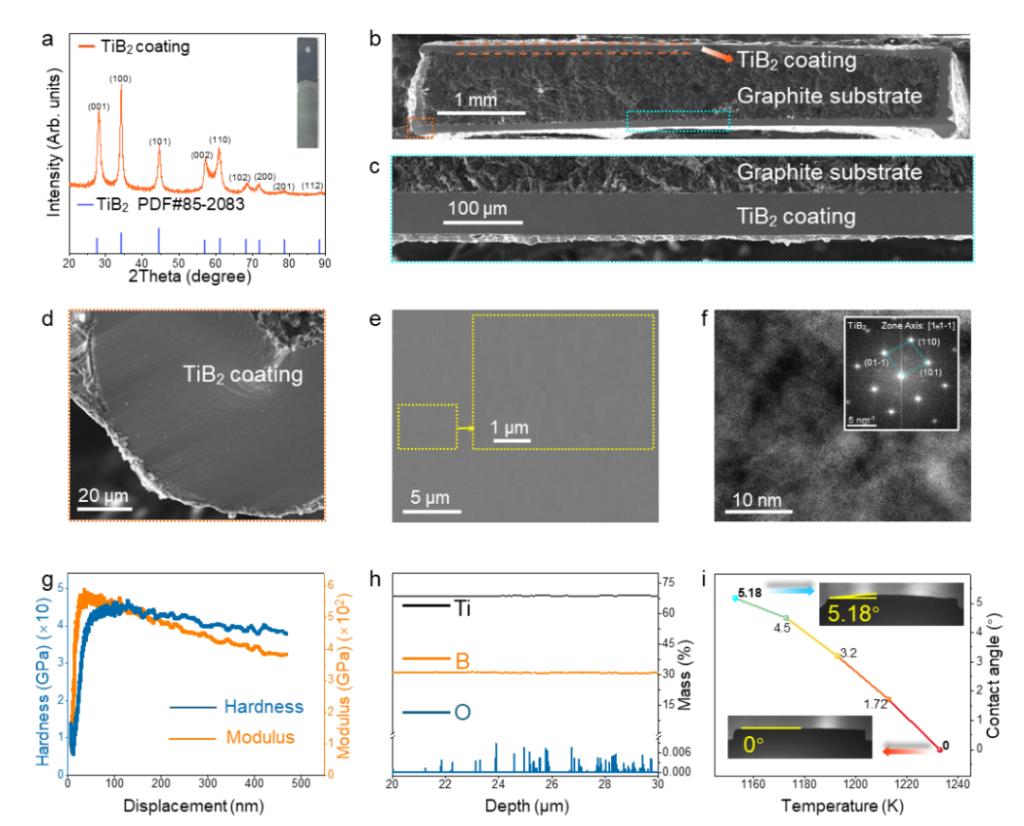 该研究首先在冰晶石基熔盐体系中通过硼热还原反应制备出平均粒径4.1 nm的超小TiB2纳米颗粒,并实现其稳定悬浮;随后施加1.2 V电泳电压沉积1 h,可在阴极表面获得厚度约60μm的TiB2涂层(图2a–c)。该涂层表现出全致密结构(图2d–f)、高硬度(图2g)、低氧含量(<90 ppm)(图2h),且对铝液润湿性优异(1233 K时接触角接近0°,图2i),为提升阴极服役稳定性提供了前提。值得关注的是,该原位制备工艺在不同冰晶石熔盐组成、不同基体材料以及不同电极配置条件下均展现出良好适用性,为其在Hall-Héroult电解槽、工业导流槽及垂直惰性阳极电解槽等多种装置体系中的推广应用奠定了基础。